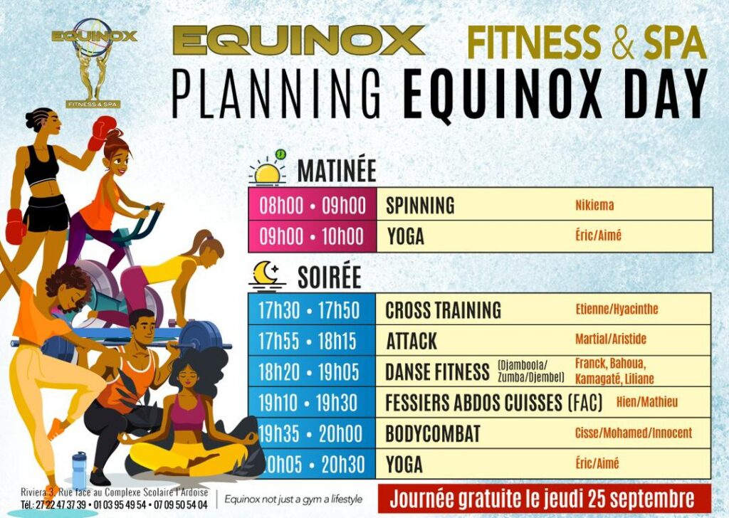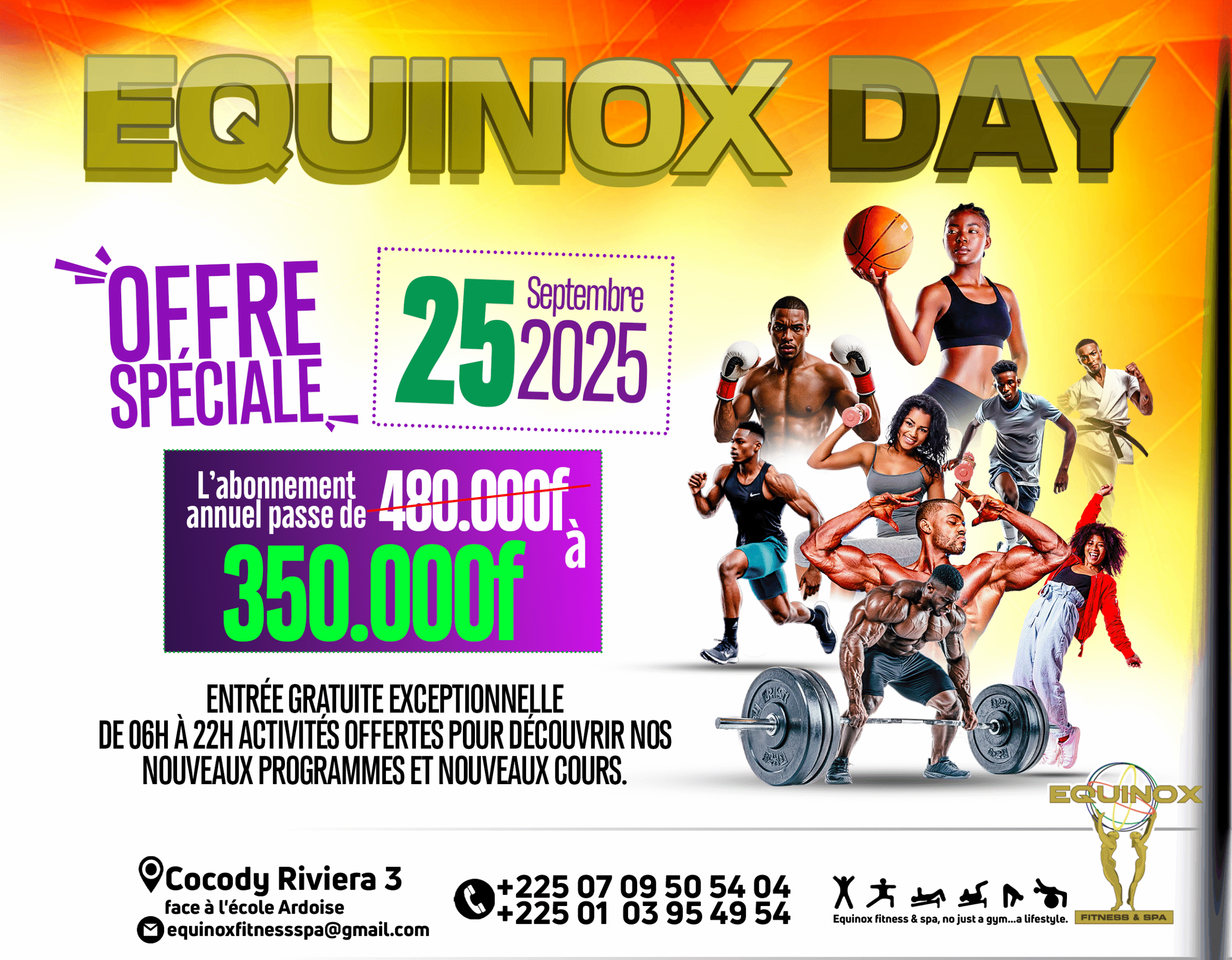 Nous sommes ravis de vous convier à un événement exceptionnel et totalement gratuit qui se tiendra chez Equinox Fitness & Spa le jeudi 25 septembre 2025 , de 6h à 22h .